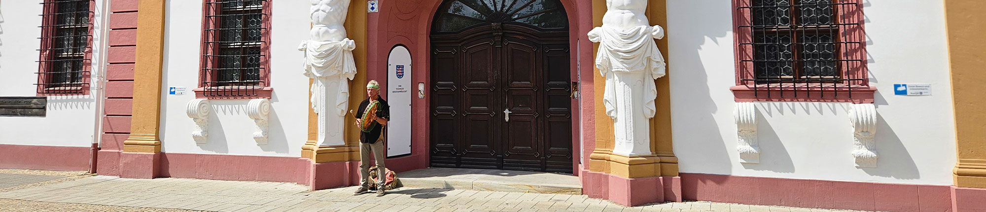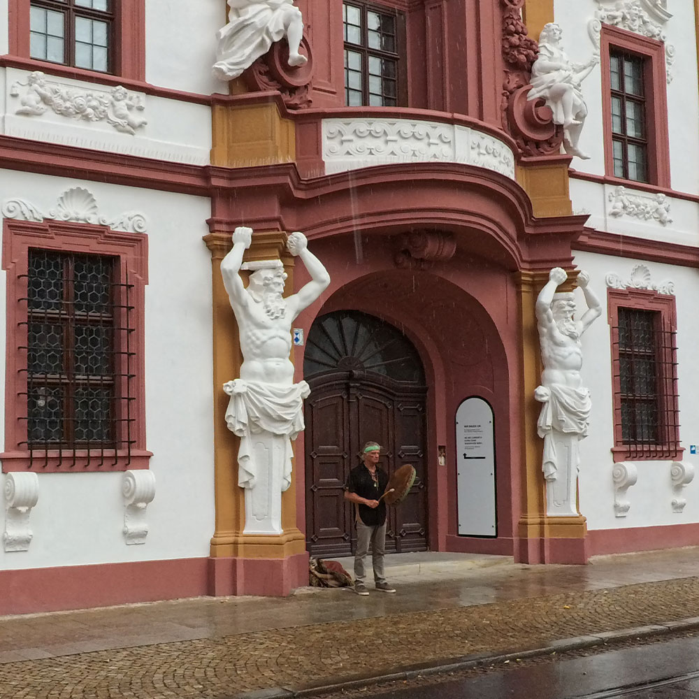 Also trommle ich laut über den großen Platz vor der Staatskanzlei, der „Hirschgarten“ heißt. Es kommt niemand aus dem Gebäude, um uns zu verscheuchen oder zu ermahnen. Die Thüringer sind offensichtlich sehr gelassen und tolerant.
